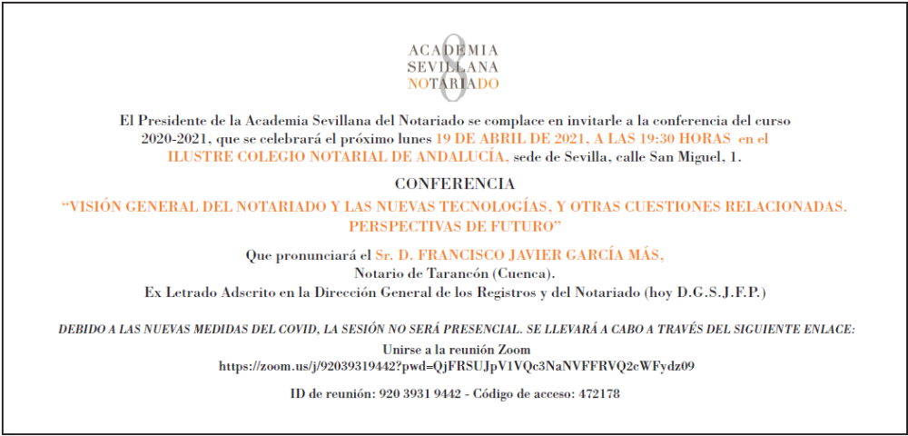 Colegio Notarial de Sevilla:  19 de abril de 2021, a las 19:30h.